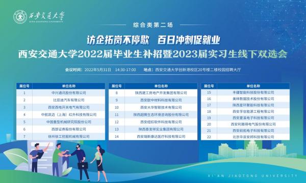 为贯彻落实党中央、国务院“稳就业”“保就业”等相关决策部署,积极贯彻落实《2022届高校毕业生就业促进周“百日冲刺”系列活动》文件要求,抢抓毕业生离校前的求职关键期,全力促进学校2022届毕业生高质量就业,为2023届毕业生提供丰富的实习实践机会,西安交通大学学生就业创业指导服务中心积极作为,于5月26日、31日在创新港校区举办2022届毕业生补招暨2023届实习生线下双选会系列活动。