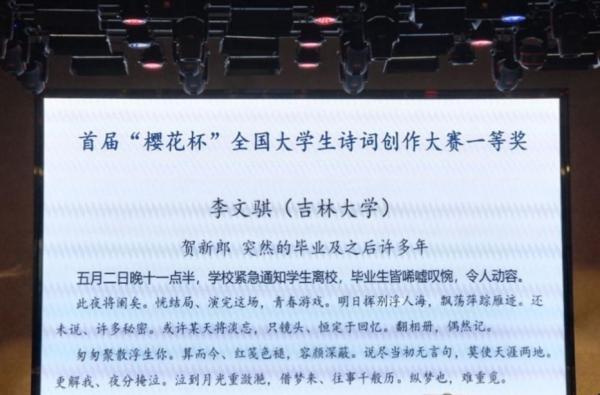在比赛进行的过程中,主办方也陆续揭晓全国大学生诗词创作大赛获奖名单。经过初审、复审、终审三个环节,最终产生冠、亚、季军各一名,优秀奖10名。来自吉林大学的李文骐同学获得冠军,他的作品《贺新郎 突然的毕业及之后许多年》体式规范,音律优美,富有深刻的感情,真挚地回忆大学生活,用诗歌留住学生时代的记忆。来自湘潭大学的龙健同学获得季军,一首《咏西迁精神》既表达对前辈的追忆和对西迁精神的传承,又展现出新时代青年勇担重任的精神风貌。来自上饶师范学院的叶显子同学获得季军,他的作品《落樱四首·其四》借物抒怀,抒发了真挚的情感。来自杭州师范大学的赵王玮同学、西南大学的汤成长等10位同学获得优秀奖。现场由学生代表代为领取以上奖项。
