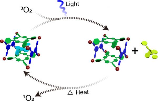 针对这一问题,西安交通大学材料学院张明明课题组利用四羧酸联苯与四吡啶卟啉作为构筑基元,通过Pt基配体的连接构筑了桶状的卟啉基金属有机笼。这种多齿配体的螯合配位利用金属配位键的协同性大大提高了其结构的稳定性,为其功能的研究与拓展奠定了基础。值得指出的是,在该结构中两个卟啉分子之间的距离为8.0 Å ,有利于通过π -π堆积作用来有效地识别多环芳烃类分子。当蒽的衍生物作为客体分子时,该金属有机笼在光照下可以有效地产生单线态氧用以氧化其内部包裹的客体分子,进而破坏蒽衍生物的平面结构,使得其主客体结合能力大大下降,从而在金属笼的空腔里被释放出来,进一步加热该体系会使得氧化的客体分子释放出单线态氧回到其初始状态,进而被重新包裹到金属笼的空腔内。这种通过光氧化驱动的客体的可逆封装与释放过程有望被用于构建新型的刺激响应性材料。