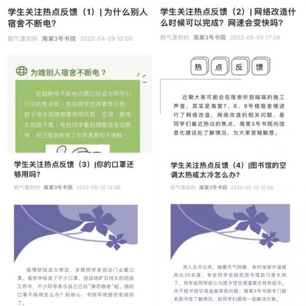 “什么时候宿舍能不断电?”“网络改造什么时候完成?”“校内施工什么时候结束?”“口罩库存‘弹尽粮绝’了怎么办?”面对学生提出的有关日常学习生活的问题,海棠3号书院对学生关注热点问题积极作出回应。