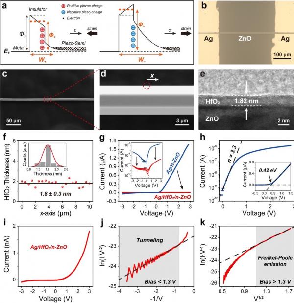 (a)压电极化调控压电电子学隧道结的界面能带示意图。(b)压电电子学隧道结应变传感器的光学图像。(c,d)HfO2/n-ZnO纳米线的SEM图像。(e)沿(d)中的标记位置测试的HfO2/n-ZnO纳米线表面的高分辨TEM图像。(f)绝缘层HfO2的厚度统计图。(g)Ag/HfO2/n-ZnOPTSS和Ag/n-ZnOSSS的I-V曲线。(h)计算得出Ag/n-ZnOSSS的势垒高度约为0.42 eV。(i-k)Ag/HfO2/n-ZnO的I-V、ln(I?V-2)与-1/V以及ln(I?V-1)与V1/2关系曲线。