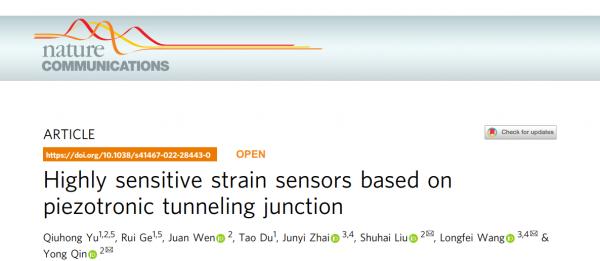 近日,西电材料学院先进材料与纳米器件研究所和兰州大学合作的研究成果以“Highly SensitiveStrainSensors Based on Piezotronic Tunneling Junction”为题发表在国际知名期刊Nature Communications上。博士生于秋红为本文第一作者,西电材料学院为第一单位,通讯作者为兰州大学秦勇教授、刘书海副教授和中国科学院北京纳米能源与系统研究所王龙飞博士。