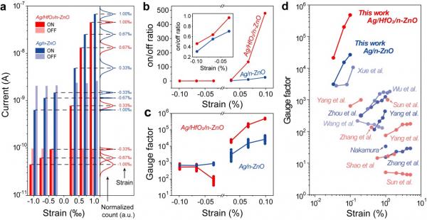 PTSS和SSS两种器件的“ON”态和“OFF”态电流的统计分布及其直方图(图a)表明,统计电流随拉伸应变的增大而增大,随压缩应变的增大而减小。这一趋势与PTSS和SSS的I-V曲线变化特征一致。虽然PTSS的“OFF”态电流比SSS的“ON”态电流小很多,但在0.10%的拉伸应变下,PTSS的“ON”态电流与SSS的“ON”态电流几乎达到了相同的量级,并且,PTSS的开关电流是Ag/n-ZnO SSS的18.6倍(图b)。GF值代表压电器件的应变灵敏度,是应力/应变传感器件的关键性能参数。GF值越大,代表了器件的力传感性能越好。图c-d对比总结了PTSS、SSS和一些现有的基于ZnO纳米线或纳米带传感器GF值。基于Ag/HfO2/n-ZnO的PTSS与其他传感器相比,压电电子学隧道结应变传感器具有明显的优势,显示了其在应变传感方面的巨大潜力。