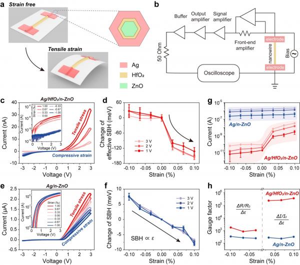 (a,b)压电电子学器件的应变图示和测试电路图。(c,e)Ag/HfO2/n-ZnO PTSS和ZnOSSS的I-V特性曲线。(d,f)分别由(c,e)中数据计算得到的有效肖特基势垒高度(SBH)的变化。(g,h)PTSS和SSS的应变传感表征。