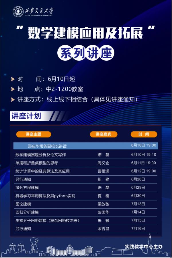 全国大学生数学建模竞赛创办于1992年,目前已成为全国高校规模最大的基础性学科竞赛,是世界上规模最大的数学建模竞赛,也是西安交大本科生参与人数最多、涉及专业最广的学科竞赛活动之一,对培养大学生实践创新能力具有重要意义。自2022年5月学校全国数模竞赛工作启动以来,通过广泛动员、积极组织,现有523支学生团队、1569名本科生报名参加本届大赛,涵盖全校22个学院。为了更好地指导同学们拓展数学建模知识面,掌握数学工具与方法,有效提高解决问题的水平与能力,备战9月份举行的“2022高教社杯全国大学生数学建模竞赛”,实践教学中心邀请校内外9名深耕数学建模研究与教学的专家举办“数学建模应用及拓展”系列讲座。