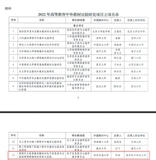 近日,教育部高等教育司发布了《2022年高等教育中外教材比较研究项目立项名单》,电子工程学院邓成教授主持申报的《通过翻译原版教材对电子信息类专业基础课程群建设的思考与研究》获批重点项目立项,全国仅12项,这是学校教学改革取得的又一进展。