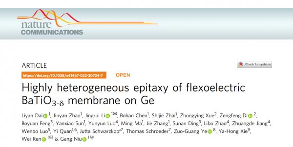 研究工作2022年5月30日以《锗衬底上挠曲电钛酸钡膜的高度异质外延》(Highly Heterogeneous Epitaxy of Flexoelectric BaTiO3-δMembrane on Ge)为题发表在国际权威期刊《自然通讯》(Nature Communications)上。西安交通大学为论文第一完成单位。论文第一作者为西安交通大学电信学部电子学院博士生代立言。西安交通大学电信学部牛刚教授、任巍教授和李璟睿特聘研究员为论文通讯作者。西安交通大学机械学院蒋庄德院士和赵立波教授是论文共同作者。论文的合作单位还包括中国科学院上海微系统所、中国科学院苏州纳米所、德国莱布尼茨晶体生长研究所、美国加州大学洛杉矶分校、加拿大西蒙菲莎大学等。