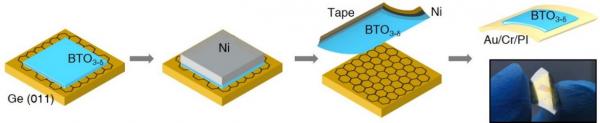 信息社会的发展需要物联网和大数据等新兴技术,因此以钛酸钡(BTO)为代表的具有铁电性、压电性、非线性光学和挠曲电特性等多种功能的钙钛矿型氧化物材料受到了广泛关注。“后摩尔”时代,人们需要将BTO等氧化物薄膜与硅衬底集成;此外,生物传感、穿戴式电子器件等新型应用对于柔性衬底上高质量氧化物薄膜的需求日益迫切。但是,无论是在硅衬底上或是柔性衬底上实现外延单晶BTO薄膜都非常困难。硅表面在氧化物薄膜的生长初期极易被氧化,生成的非晶态二氧化硅层妨碍了外延薄膜的实现。柔性衬底的主流是有机聚合物材料,它们通常不耐高温,其熔化温度低于外延单晶BTO薄膜的生长温度。