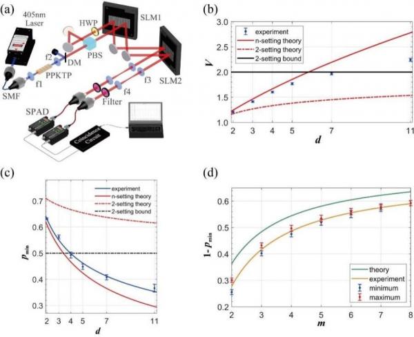 (a) 双光子高维导引实验装置图 (b) 对导引不等式的违反程度