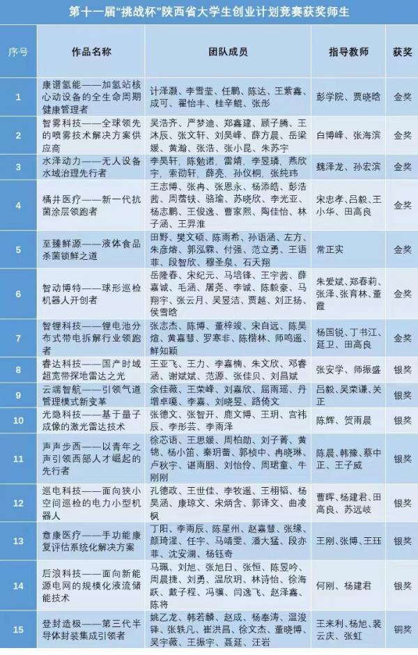 6月25日,第十一届“挑战杯”陕西省大学生创业计划竞赛闭幕式暨颁奖仪式在西安理工大学曲江校区举行。本次竞赛由共青团陕西省委、中共陕西省委教育工委、陕西省科学技术厅、省人力资源和社会保障厅、省科学技术协会、省社会科学院、省学生联合会、西咸新区开发建设管理委员会联合主办,分普通高校组与职业院校组两个组别。西安交大在本次竞赛中获金奖7项,以团体总分第一的成绩获普通高校组最高荣誉“挑战杯”。