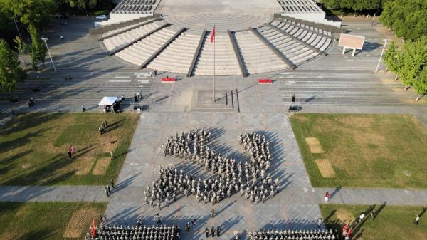 最后,伴随《军礼》优美的旋律响起,来自2020级军训文工团300余名学生迈着整齐的步伐,通过齐舞的方式,用队列变化依次呈现出“青春心向党”的字样。随着旋律变化,同学们快速变换队形,在激昂的旋律中,一枚“党徽”赫然出现在礼仪广场中央。学生以铿锵的青春之声,齐声高喊“青春心向党,建功新时代”,展现出西电学子为实现中华民族伟大复兴的中国梦贡献青春力量的青春志向和昂扬风貌!