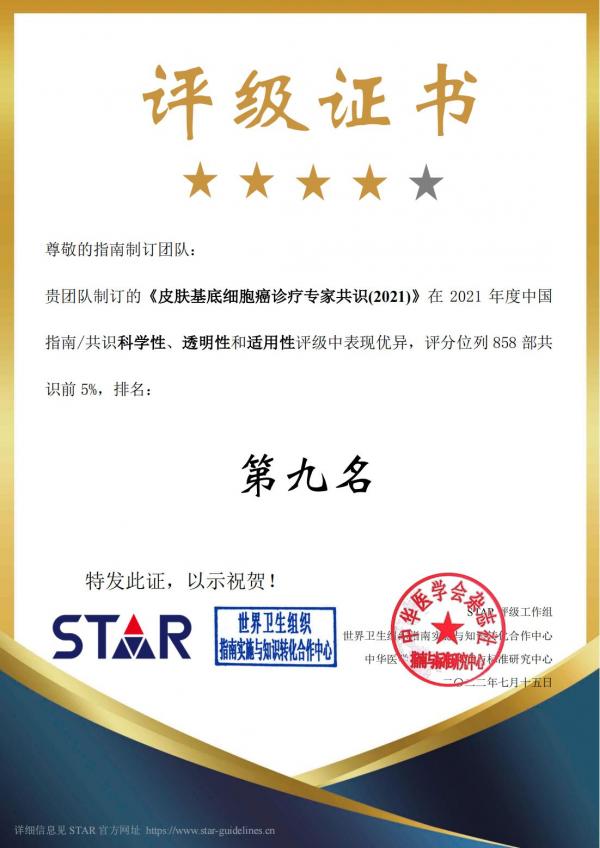 近日,由西安交通大学第二附属医院皮肤病院执笔撰写的《皮肤基底细胞癌诊疗专家共识(2021)》《皮肤鳞状细胞癌诊疗专家共识(2021)》在STAR指南评级中分别位列皮肤科领域共识第一、第二,在参与排名的858篇共识中位列第九、第十三。
