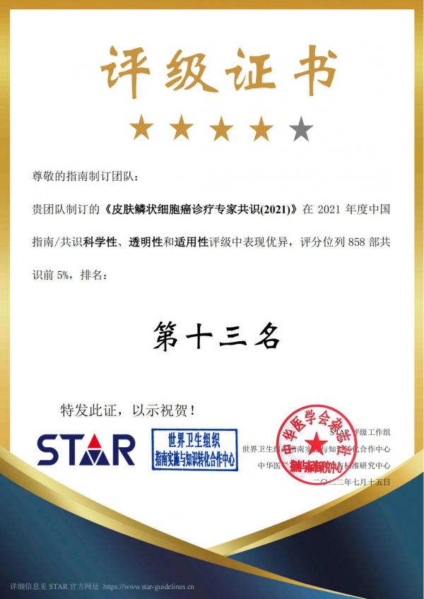 由交大二院皮肤病院执笔制订的另一部专家共识——《皮肤鳞状细胞癌诊疗专家共识(2021)》也在STAR指南评级中排名取得优异成绩,位列皮肤科领域共识第二,在参与排名的858篇共识中位列第十三。交大二院皮肤病院耿松梅教授、朱龙飞医师和彭斌医师为该共识的执笔人。