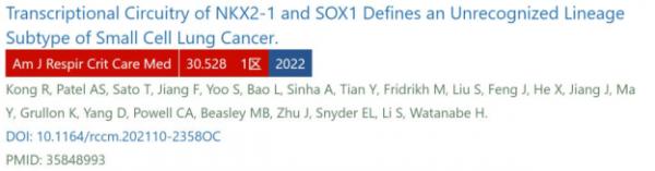近日,西安交通大学第二附属医院胸外科与美国西奈山伊坎医学院(Icahn School of Medicine at Mount Sinai)呼吸科合作,在American Journal of Respiratory and Critical Care Medicine(影响因子30.528)发表题为“Transcriptional Circuitry of NKX2-1 and SOX1 Defines an Unrecognized Lineage Subtype of Small Cell Lung Cancer”的研究型论文。孔冉冉主治医师是文章的第一作者,西安交通大学第二附属医院胸外科是第一单位,李少民主任和Hideo Watanabe教授是共同通讯作者。贺西京教授(作者的博士研究生导师)、胸外科周斌主任医师、姜建涛教授、马跃峰副主任医师、杨晓平护士长、交大一附院肾内科冯婕副主任医师以及交大二院胸外科同事都为本课题作出了重要的贡献。