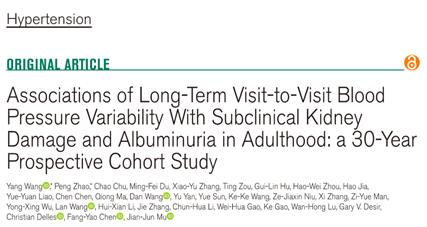 4月,Hypertension杂志在线发表牟建军教授团队在血压变异性与亚临床肾损伤领域的重要研究成果。一附院为该论文的第一和通讯作者单位。汪洋博士和西安交大公卫学院的赵芃为共同第一作者,牟建军教授和西安交大公卫学院的陈方尧副教授为共同通讯作者。文章首次全面研究长期血压变异性与亚临床肾损伤的发生以及成年期蛋白尿之间的关系。研究发现,从儿童期到成年期,血压变异性越大,亚临床肾损伤及蛋白尿的发生风险越高,提示早期识别长期血压变异性有助于预测远期的肾脏疾病和心血管疾病风险,对于深入认识高血压与CKD的关系及其探寻早期防控措施具有重大意义。