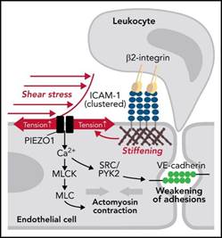 7月21日,一附院袁祖贻教授及其团队王胜鹏教授及德国马普所Stefan Offermanns院士团队在血液领域顶刊Blood杂志以封面文章的形式刊发研究文章。王胜鹏为第一作者和通讯作者,Stefan Offermanns教授为共同通讯作者,一附院为该论文的第一和通讯作者单位。该研究报道了白细胞在跨越血管转移过程中,受到血流剪切应力的干预,引起血管内皮细胞膜张力升高,该机械力被Piezo1离子通道感知,引起内钙升高,从而激活内皮细胞,导致内皮细胞收缩及屏障开放,最终诱导白细胞完成转移。本研究创新性地从生物力学角度揭示了血管炎症反应的关键力学机制,被Blood选为封面文章,入选Medscape当月推荐文章。