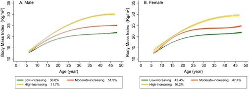 6月,由一附院牟建军教授团队与中南大学湘雅三院陆瑶特聘研究员团队合作,在国际著名期刊《柳叶刀》子刊eClinicalMedicine在线发表最新原创性研究成果,一附院为该论文的第一和通讯作者单位,汪洋博士与湘雅三院黎菲为该论文共同第一作者,牟建军教授与陆瑶研究员为共同通讯作者。此项研究基于“汉中儿童青少年高血压研究队列”,使用基于组的轨迹建模方法(GBTM)探索了自1987年以后近30年的BMI轨迹,代表着中国改革开放30年来人口的体重变化,发现儿童期、青春期、成年期和中年期呈现逐渐上升趋势的BMI轨迹与晚期较高的尿微量白蛋白排泄和蛋白尿风险显著相关,为心肾疾病的早期防治提供了潜在干预策略。