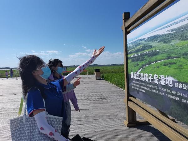 实践团队来到了世界最大的丹顶鹤繁育基地——扎龙自然保护区,这里是齐齐哈尔的“生态名片”,也是鹤城的底蕴所在。成群的丹顶鹤翩翩起舞,大家置身于丰茂密实的芦苇丛中,目光跟随着飘逸的丹顶鹤,感受着自然清新的生态环境,领悟着人与自然和谐共生的真谛。