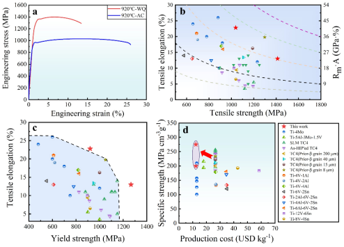 与已报道的马氏体钛合金材料的力学性能、原料成本对比