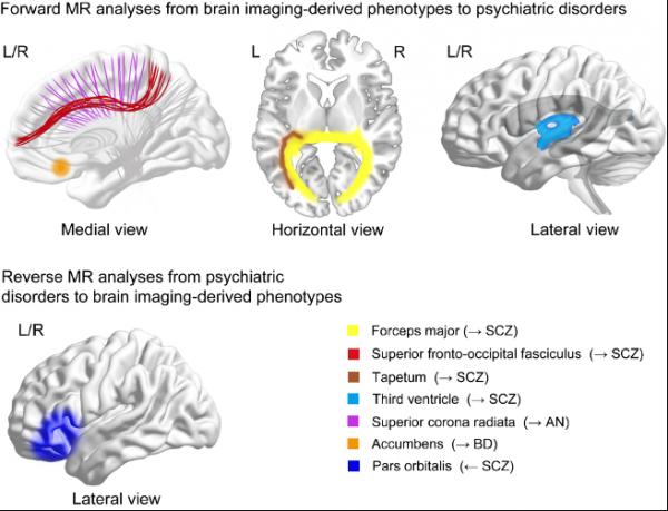 精神类疾病是一组脑功能紊乱的复杂疾病,会导致情感、认知和行为受到干扰和破坏。全球约有数亿人患有不同的精神障碍,被列为严重的公共卫生问题。近年来,脑影像学数据在脑疾病和功能的研究中受到广泛关注。以核磁共振成像为代表的脑影像技术,可用于活体无创定量评估人脑结构、连接和功能的特性。虽然已有大量的观察性研究证据表明,精神疾病患者与健康正常人的脑影像表型存在显著差异,但脑影像学数据与精神障碍发病机制的因果关系尚不明确,探讨脑影像表型对精神疾病的因果作用具有重要的生物学和临床研究意义。