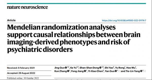 近日,西安交通大学生命学院生物医学信息与基因组学中心杨铁林教授团队在《自然-神经科学》(Nature Neuroscience)在线发表了题为《孟德尔随机化研究揭示脑影像表型与精神类疾病风险的因果关系》(Mendelian randomization analyses support causal relationships between brain imaging-derived phenotypes and risk of psychiatric disorders)的研究成果。该研究利用遗传证据系统性证明了脑影像表型与精神类疾病之间存在的因果关系,有助于在脑影像学层面更好地预测和干预精神类疾病的发生。