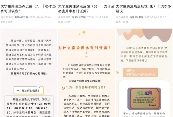 同时,书院在“海棠4号书院”公众号中增设“大学生关注热点反馈”栏目,及时将问题处理结果反馈给学生。迄今为止,书院已针对用水、用电、网络等问题推送了多篇热点反馈推文。