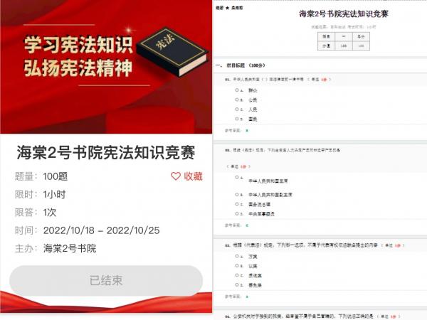 为进一步弘扬宪法精神,切实提升学生法律观念和法治意识,海棠2号书院以现行宪法颁布实施40周年为契机,近日面向书院全体学生开展了“学宪法·讲宪法”线上知识竞赛。