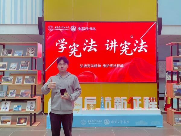 陈科旭同学说:“宪法是国家的根本大法,它是我们国家长治久安、繁荣发展的坚实保障。作为大学生,我们必须树立法治观念和思维,自觉学习宪法和其它法律知识,在日常生活中以自己的行动去弘扬宪法精神、维护宪法权威,推动建立风清气正、和谐安定的法治社会环境,做宪法的忠实崇尚者、自觉遵守者和坚定捍卫者。”