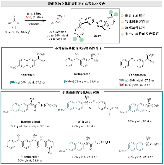 手性与生命现象密切相关,天然氨基酸、单糖及蛋白质、DNA等多以单一手性形式存在。目前市售和在研的小分子药物中超过60%都带有手性中心。α-手性羧酸广泛存在于生物活性分子中,更是一大类非甾体抗炎药的关键骨架。目前工业中α-手性羧酸的合成主要采用不饱和酸的不对称氢化,存在原料不易得,使用贵金属催化剂及高压设备的局限。近年来,以二氧化碳为试剂的羧基化反应吸受到关注并取得进展,但主要集中在消旋反应,尚不能有效获得单一手性产物。若能以易得原料和二氧化碳一步直接合成手性羧酸药物,将具有潜在的重要工业价值。