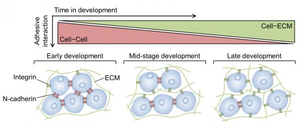 钙黏素介导细胞-细胞间的力学相互作用逐渐过渡到整合素介导细胞-ECM间的力学相互作用