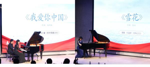第四阶段新时代是中国钢琴音乐多元化发展的盛世巅峰,《雪花》(演奏者:刘奕轩,材料2203班)和《我爱你中国》(演奏者:权小童,哲学强基2201班)这两首耳熟能详的经典曲目引起了听众强烈的共鸣。