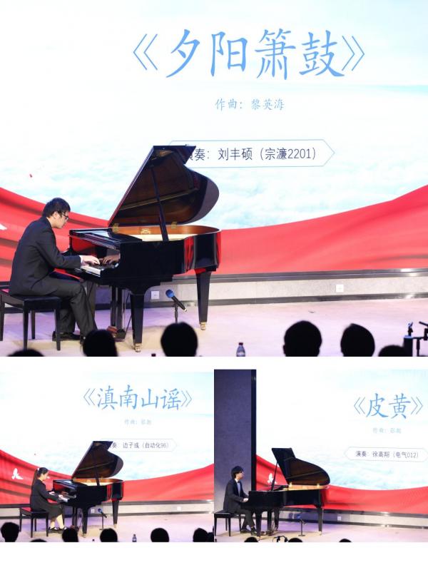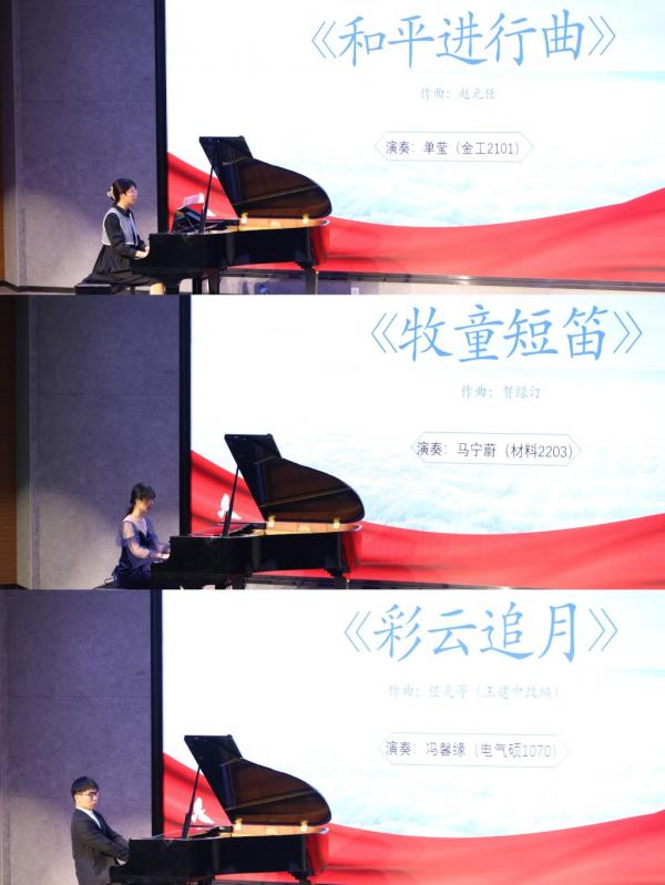 第一阶段音乐会选取了中国作曲家创作的第一首钢琴曲《和平进行曲》(演奏者:单莹,金工2101班)、具有里程碑意义的《牧童短笛》(演奏者:马宁蔚,材料2203班)以及早期创作的民族风格浓郁的《彩云追月》(演奏者:冯馨缘,电气硕1070班)作为代表作品。