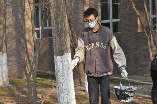 同学们在听完工作人员的讲解之后,便各自分工,有序开展活动,以饱满的热情和负责的态度保质保量的完成了此次劳动任务,为校园的树木都换上了白色“服装”,树木整齐划一、焕然一新。