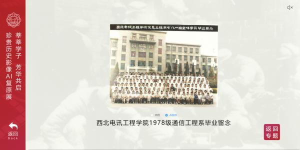 线上展览以红色为基调,设置四个专题展区,展示了西电历史上在瑞金、延安、获鹿、张家口、西安等地的建筑旧址,八十年代之前教学及科研工作、校园生活和文化活动,以及各时期学员干部合影等影像资料,观众进入后可任意点击感兴趣的专题进行浏览,感受老照片AI复原前后对比,并可下载全部影像原图及复原后的图片。