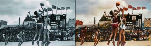1951年,军委工校男子篮球队与“八一”队进行友谊赛(左:原图,右:AI复原)