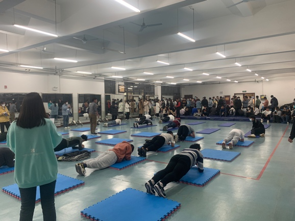 接下来就是激动人心的俯卧撑环节。该项目要求选手们在做动作时必须使身体接触到地板上的尖叫鸡,并使其发出声响,否则不计入总成绩。同学们虽然做到最后胳膊略微颤抖,汗流满面,但都取得了较为满意的成绩。其中有同学取得了一分钟100个俯卧撑的出色成绩,用实力赢得了同学们的满堂喝彩。有些同学虽然已经体力不支,但仍然拼尽全力做出动作,将永不放弃的精神展现得淋漓尽致。