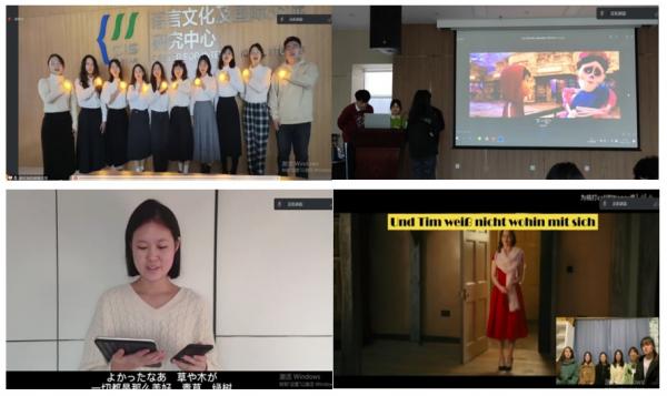 刘思雨等四位同学用一首日语合唱《那个时候》,观众们仿佛沉浸在青涩的校园时光中。死亡并不可怕,遗忘才是最终的告别,请记住你爱着和爱过的人,陈仁恺雯等同学带来英语配音《寻梦环游记》,重新演绎了这段动人的故事。沈晓丹的日语朗诵《太好了》,带着观众迎接朝阳,拥抱日落,听鸟儿和鸣,嗅花草芬芳。马艺涵等同学带来了一首德语合唱《Tim liebt Tina》,让观众们感受到德语的严谨深邃、魅力无穷。