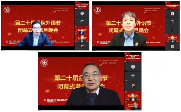 暖场视频播放结束后,来自材料学院2105班的主持人咸明杰和来自外国语学院法语001班的主持人孙萌用一段精彩的开场白为本场晚会拉开了帷幕。西安交通大学教务处处长王秋旺,外国语学院院长陈向京,党委常委、宣传部部长成进分别以视频连线的方式发表讲话并送上新年祝福。