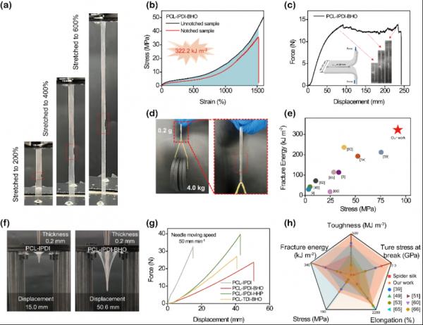 近日,西安交大化学学院张彦峰教授团队采用无溶剂聚合的方法,通过聚己内酯二醇(PCL)、二异氰酸酯(IPDI)和N,N-双 (2-羟乙基)草酰胺(BHO)反应制备出了具有极高机械强度和韧性的可生物降解聚氨酯弹性体。这种弹性体结构中丰富的氢键相互作用阻碍了PCL段的结晶,促进了在弹性体内部形成均匀分布的硬相微域。通过对弹性体内部氢键相互作用和分布的进一步优化,奇迹般地实现了极高的强度(92.2 MPa的断裂强度、1.9 GPa的断裂真应力)和韧性(480.2 MJ·m-3)以及前所未有的高断裂能(322.2 kJ· m-2),加之良好的生物相容性和降解性,可通过3D打印技术制成疝气补片应用于生物医学。此外,就机械性能而言,该弹性体在柔性电子、缓冲吸能等方面同样具有很大的应用潜力。