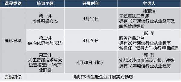 在组织开展之初,学工部便会同企业在课程内容、讲师选聘、讲授形式上进行了细致沟通。在课程内容设置上,充分发挥行业内知名企业创新优势,贴合学生能力提升需求,确定了“积极心态培育”“个人领导力”及“新技术前瞻”等方面内容。开展第一阶段,选聘3位拥有15年以上通信行业从业经历及职场管理经验的企业讲师授课,理论讲授同时传授项目实战经验。课程还采取“理论导学+实践研学”模式,在理论课程全部结束后,组织研学参访开启企业“初认知”,巩固授课效果。