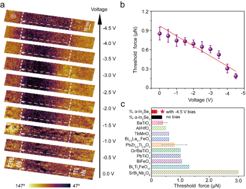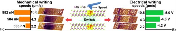 然而,在实现较高速度写入铁电畴图案时,畴翻转所需临界应力的增大将对二维范德华铁电材料造成机械疲劳或结构损伤。为减小铁电畴极化翻转所需的临界应力,研究人员提出了电力耦合的调控策略,以便有效降低在较高写畴速度下翻转铁电畴所需的临界应力。在二维α-In2Se3中,利用电力耦合的调控策略,获得了铁电极化翻转的超低临界应力。