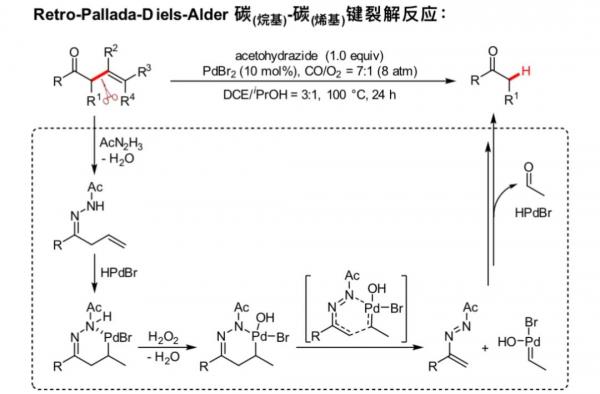 研究团队以β,γ-烯基酮为底物,以酰基肼为环化辅助剂,在钯催化下通过Retro-Pallada-Diels-Alder的反应过程,实现了羰基α位碳(烷基)-碳(烯基)σ键的高选择性裂解。其中四价钯中间体的生成和钯氢催化剂的循环是该反应的关键。