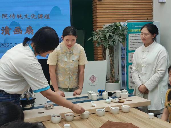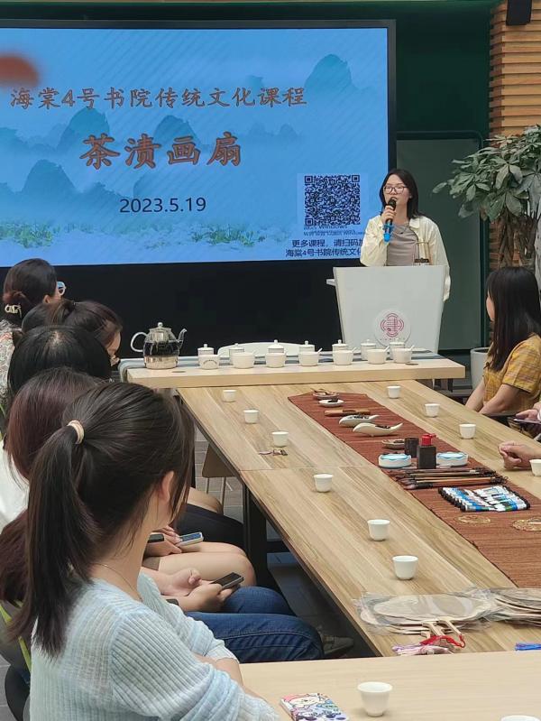 茶道是一种以茶为媒的生活礼仪,也被认为是修身养性的一种方式。为了激发同学们对于传统文化的热情,提高审美能力,增强文化自信及文化自觉。5月19日下午,海棠4号书院传统文化课程第十讲——“茶渍画扇”课程于二楼后厅开课。