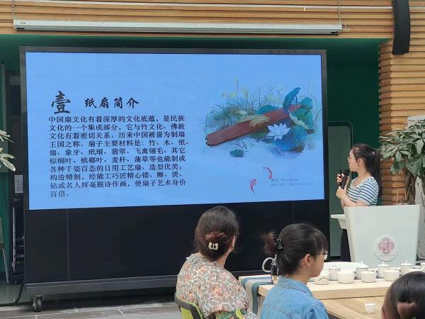活动伊始,于心悦同学作为本次青年讲堂的主讲人,为在座的同学们详细地介绍了茶渍画扇中茶与扇的“渊源”以及茶渍与绘画的“跨界”碰撞。此外,她还用一小段视频展示了茶渍画的制作过程与最终成品,在场的同学们都兴趣盎然。