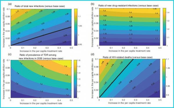 研究发现,当前防控措施下(年治疗中断速率0.025-0.15,年治疗速率0.23-0.42),2022-2030年广西累积总新发感染人数将达到145391,其中新耐药人数为7637,累积死亡人数为51965。若年治疗速率增加0.1-0.2,则累积总新发感染人数和死亡人数将分别降低1.63%-2.93%和3.52%-6.16%。然而,年治疗中断速率仅增加0.0114-0.0220(或0.0352-0.0695)就能抵消上述扩大ART覆盖降低感染(或死亡)人数的收益。若年治疗速率(或年治疗中断速率)每增加0.05-0.1,则新耐药人数将增加0.16%-0.30%(或22.18%-41.15%)。