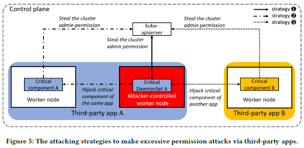 为系统化分析第三方应用的过度权限问题,论文基于过度权限滥用的不同路径设计了三种攻击策略。首先,一个攻击者可以利用第三方应用运行在每个节点上的DaemonSet来直接获取集群管理员令牌,实现集群范围的特权逃逸;其次,攻击者可以组合利用DaemonSet和同一个第三方应用中其它组件的权限来获取集群管理员令牌,实现逃逸;第三,攻击者可以利用来自不同第三方应用中其它组件的权限获取集群管理员令牌,实现特权逃逸。