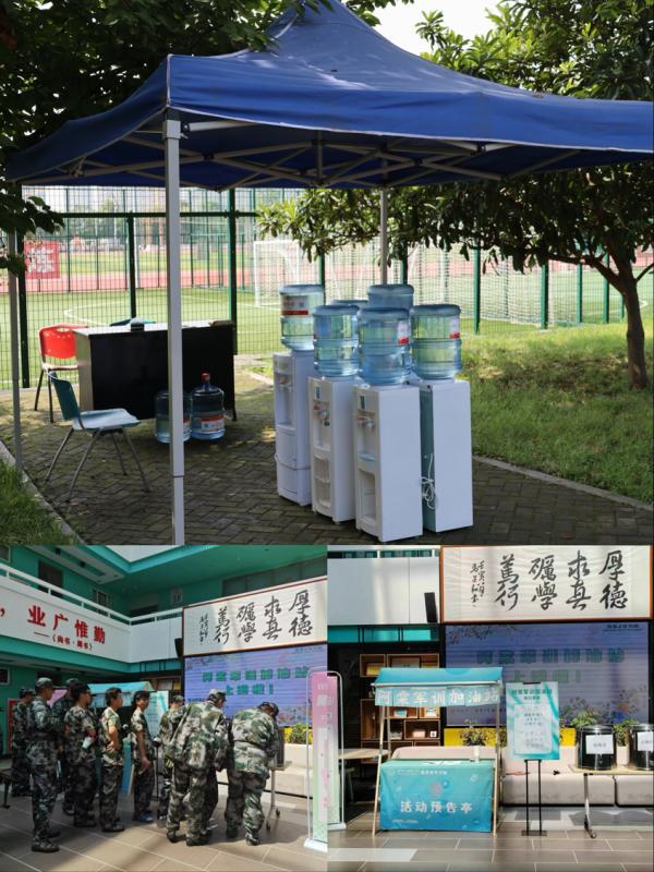 为保障学生顺利完成军事训练,军训旅充分利用校内荫凉处设置训练地点,避免高温暴晒,并设置消暑降温饮用水保障点;军训旅干部全天在岗跟训,协助施训的同时做好学生的关心关爱工作;校医院在南北操场、信远楼安排医护人员值班,随时处理突发情况;海棠书院置办了“阿棠军训加油站”,给参训学生赠送三种清凉饮品,免费分享“军训好物”。