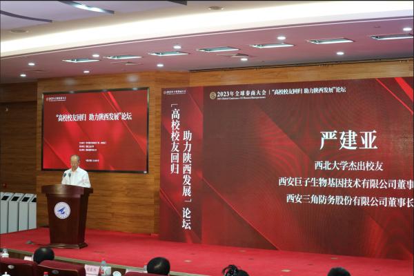 本次论坛是2023年全球秦商大会特色活动之一,论坛上,省委组织部对陕西人才引进政策进行了全面宣讲。7位专家代表和杰出校友代表围绕发挥校友优势、助力陕西发展作主旨报告和主题发言。西安巨子生物基因技术有限公司董事长、西安三角防务股份有限公司董事长严建亚作为我校校友代表发言,他表示,“西大学子”与“陕西乡党”的身份印记相得益彰,他本人及他创办的企业与陕西结成了休戚相关、荣辱与共的命运共同体,愿积极承担起时代赋予企业家的责任与担当,为母校、为陕西的发展贡献新的磅礴伟力。