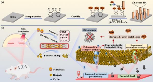 针对耐甲氧西林金黄色葡萄球菌(MRSA)对多种抗生素具有耐药性,严重威胁人类健康这个问题,研究人员探究了近红外照射下铜掺杂羟基磷灰石“纳米棒”的抗感染,提高组织整合的性能。研究表明,温和的光热刺激增加了细菌膜的通透性,加速了铜离子的摄入,导致了细菌的二氢脂酰胺s-乙酰转铁酶聚集、谷胱甘肽过氧化物4失活以及铁氧还蛋白和脂酰合成酶的不稳定等,引发了包括MRSA、大肠杆菌和金黄色葡萄球菌在内的细菌发生铜死亡。在近红外照射下,成纤维细胞响应有所上调,种植体表面软组织整合有所改善,这种多功能涂层复合光热的治疗策略在提高PEEK临床性能方面具有很大的应用前景。相关成果以“Low-Dose Cu Ions Assisted by Mild Thermal Stimulus Inducing Bacterial Cuproptosis-Like Death for Antibiosis and Biointegration”为题发表在Advanced Functional Materials杂志上。