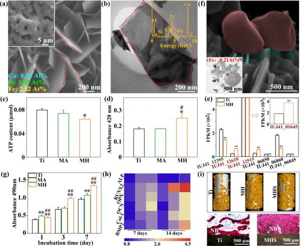 图2.(a)“纳米剑”的SEM形貌和(b)TEM形貌;试样表面培养1天后金黄色葡萄球菌的(c)ATP合成量,(d)胞膜通透性,(e)与铁死亡相关的差异基因表达,和(f)形貌;(g)MTT法检测试样表面培养1、3、7天的成骨细胞活力;(h)试样表面培养7、14天后成骨细胞ALP、RUNX2、OPN、OCN、Col-1和BMP2的表达;(i)试样植入大鼠松质骨内6周后Micro-CT图像及VG染色结果。*: p < 0.05和**: p < 0.01与Ti相比;#: p < 0.05和##: p < 0.01与MA相比。